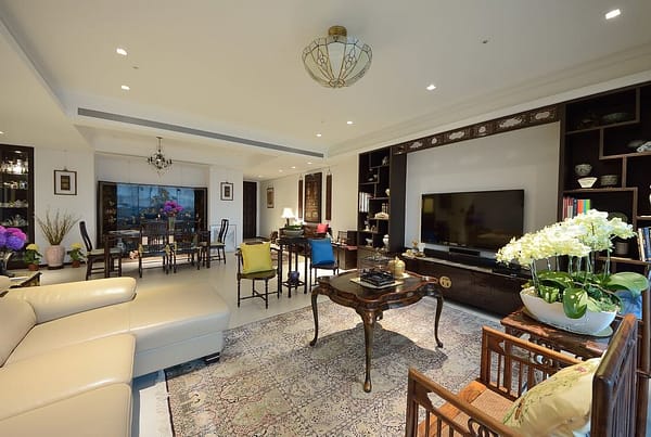 大片面積的大地暖色系色彩運用,可產生穩重安穩而厚實溫暖的感覺。天然石材英格蘭米黃的天然大理石質感高貴,不僅具有自然紋路的藝術性,同時因特有的厚實貴重感受,有著華麗大氣的感受。夫妻回到家中一起觀賞影音電視,那種安穩又有些華麗天然的感受,充滿濃濃的家的溫馨。 自然充足的採光,所以大面窗的設計是必要的,搭配窗簾,當光與風透過窗簾引入室內,讓人自然而放鬆心情。家具舒適、線條簡潔與質感兼具也是特色之一。