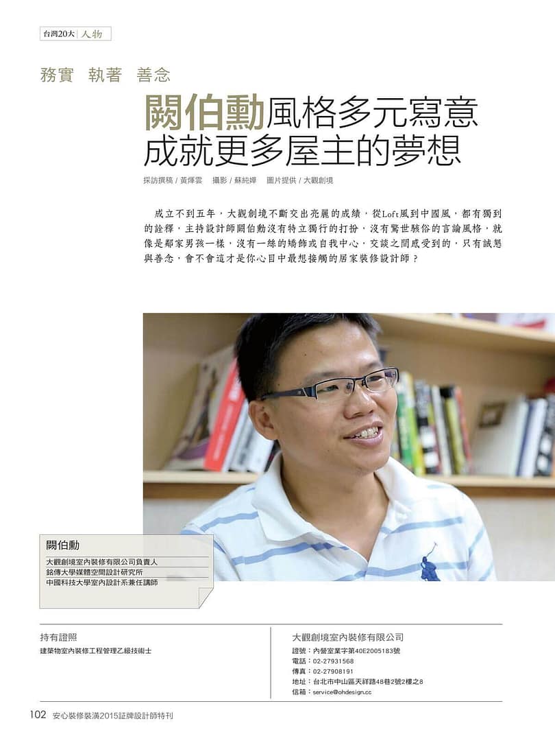 【媒體報導】感謝安心雜誌「2015台灣証牌設計師特刊」採訪刊登:闕伯勳風格多元寫意,成就更多屋主的夢想