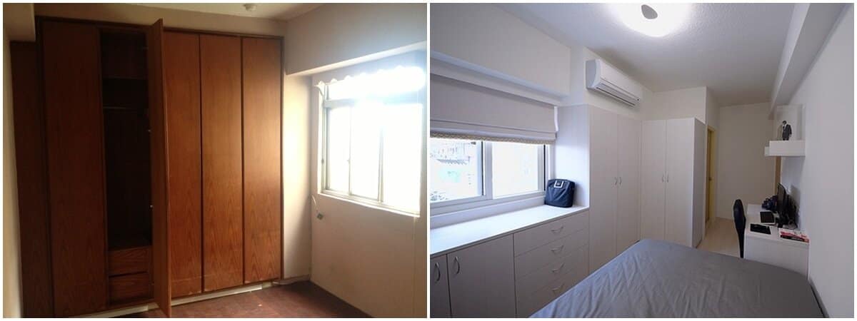 主臥室裡原先都是老舊的衣櫃,我們將其全部拆除,整間加入美美的系統櫃。