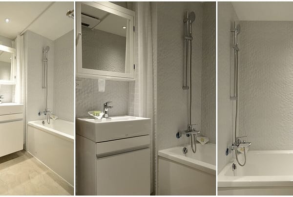 設計師為了將壁刀的問題破解,於是將尖角的天花板修成了弧形,意外產生出像波浪般的效果,設計師說在這純淨的北歐風中增加了一種寬廣懷抱的意象。