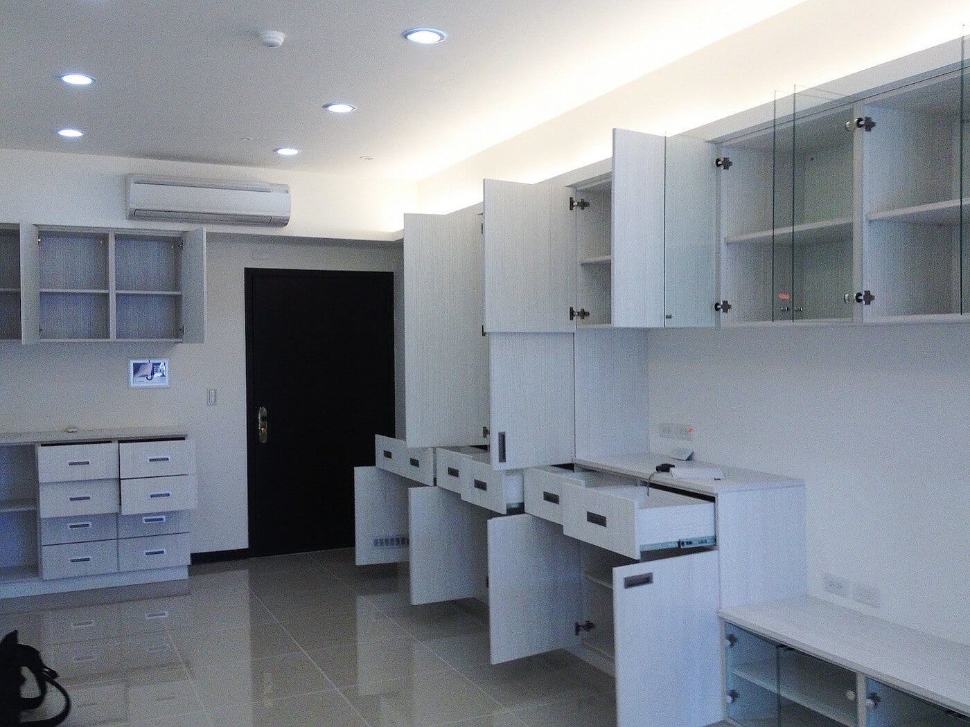 設計師與業主討論後,除了展示空間之外,設計了許多收納空間,還為其收納空間打造統一造型門板。