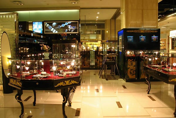 設計師用大理石紋路壁紙來展現質感。黑色大理石紋路帶痕刻精雕細琢的感受,象徵著神秘的魔法空間更衣室,換裝後如灰姑娘的變身。淡灰色大理石紋路壁紙則讓空間變輕盈,避免空間過度沉重,產品也可以跳脫出來。