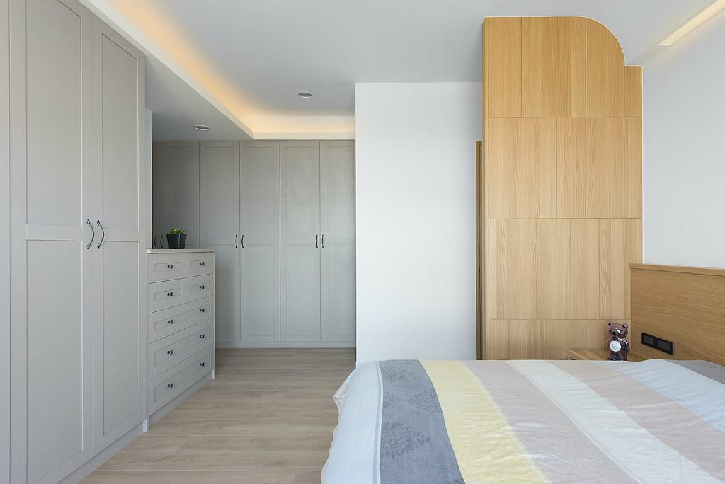 主臥房的空間,以布紋質感系統櫃組成大量有特色造型的衣物收納。清爽舒適搭配。是個讓使用者完全放鬆休息的所在。