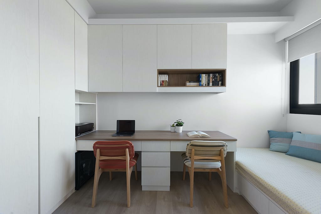 書房空間,設置單人床寬度的臥踏區,除了時差工作的休息處外,也可以做為客房空間,系統櫃製作臥踏亦兼顧收納功能。