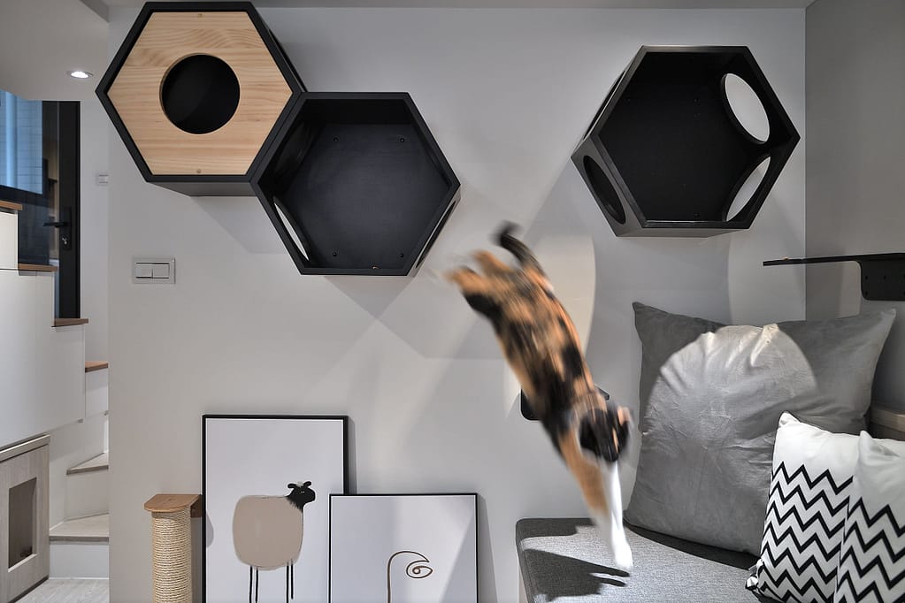 工作回家打開門後,視野與療癒感,一天工作緊繃感得到充份放鬆。喵星人懶懶的躺在臥踏區,肚子翻起,好似是對完工後的讚嘆,貓牆以及遊戲、廁所空間,利用牆壁準確利用,即使玩躲貓貓,也是找不到我。
