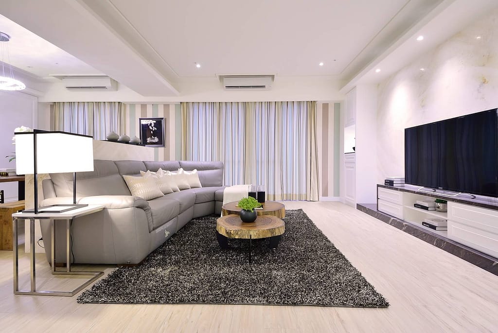 系統櫃、超耐磨地板、水泥藝術漆、水管燈 、鐵件、回收木、空心磚、軌道LED照明燈具