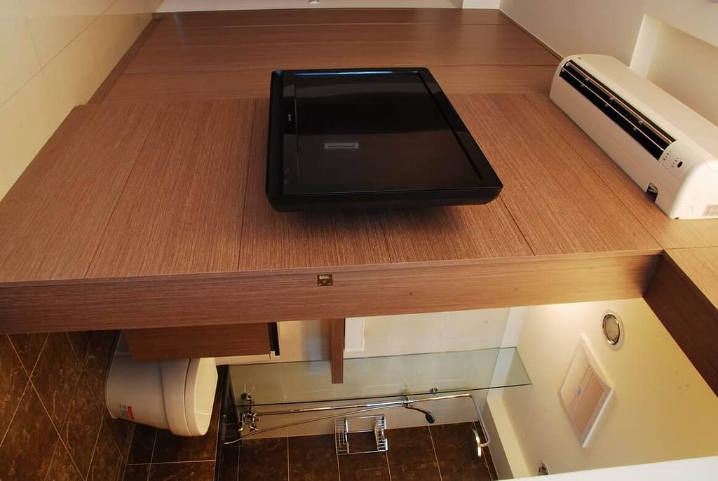 簡約氣派大方的張公館,簡約中不失大氣的設計,華麗藝術品的點綴使之更加氣派。皮質暖色系沙發加上燈光烘托,使的空間更加溫馨溫暖。色系一致暖色調,也展現主人成熟大氣的品味。仿大理石的磁磚,為浴室營造氣派典雅的氛圍。小小的玻璃簡單隔開衛浴和櫃子,使其使用能有乾濕分離的效果。